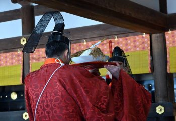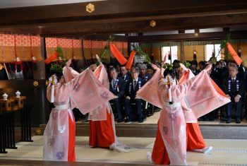 新嘗祭」は、秋の稔りに感謝するお祭りです。宮司の祝詞奏上に続き、四人の巫女により神楽「磯城の舞(しきのまい)」が奉奏されます。古来より重要なお祭りのひとつで、大祭式で行われます。