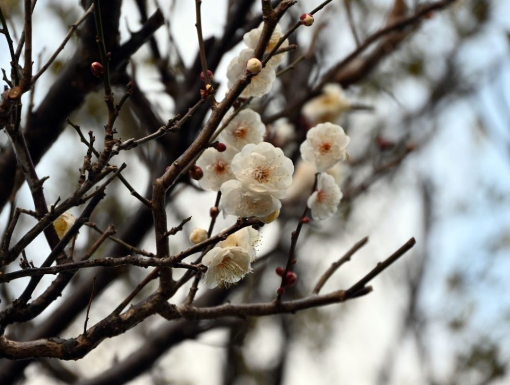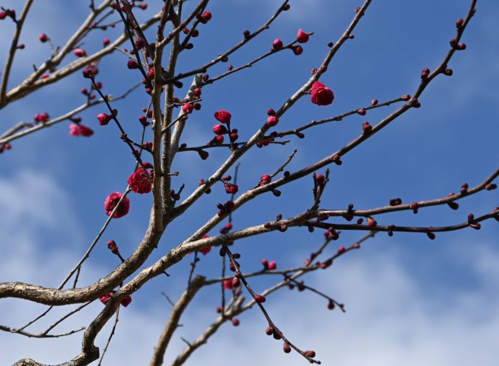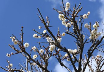 2月1日の儀式殿前の白梅、祈祷殿前の紅梅の様子です。