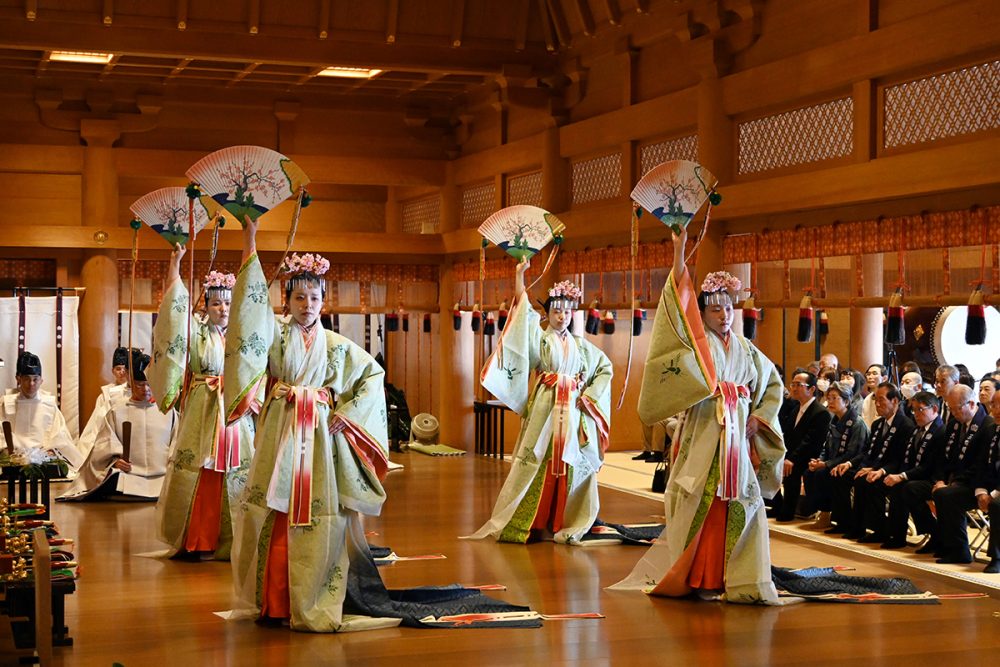 神様へのお手紙である「祈願詞」が全国の講員・会員から寄せられ、祭典ではその「祈願詞」を大前に奉奠し、宮司が祝詞を奏上します。神楽「浦安の舞」もこの祭典では正装束を四人の巫女が纏って優雅に舞い納めます。そして神職と参列者が共に「大祓詞(おおはらえのことば)」・「神拝詞」・「鎮魂詞(いのりのことば)」を唱え、みわ鈴を振り鳴らして祈る「むすびの鈴行(すずぎょう)」を行って、神前に篤い祈りを捧げます。